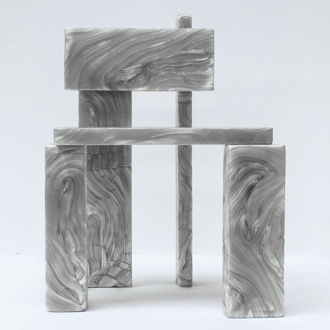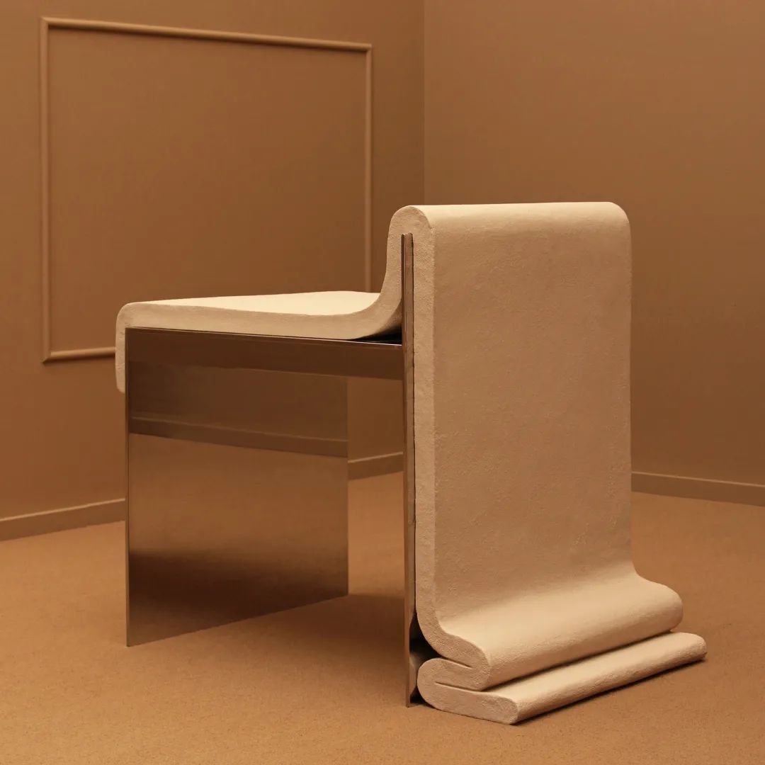這款來自紐約鮑爾工作室的液體效果椅子頂面由淺色混凝土覆蓋,混凝土垂懸在金屬底座上,并流到地板上形成堆起一塊高度。