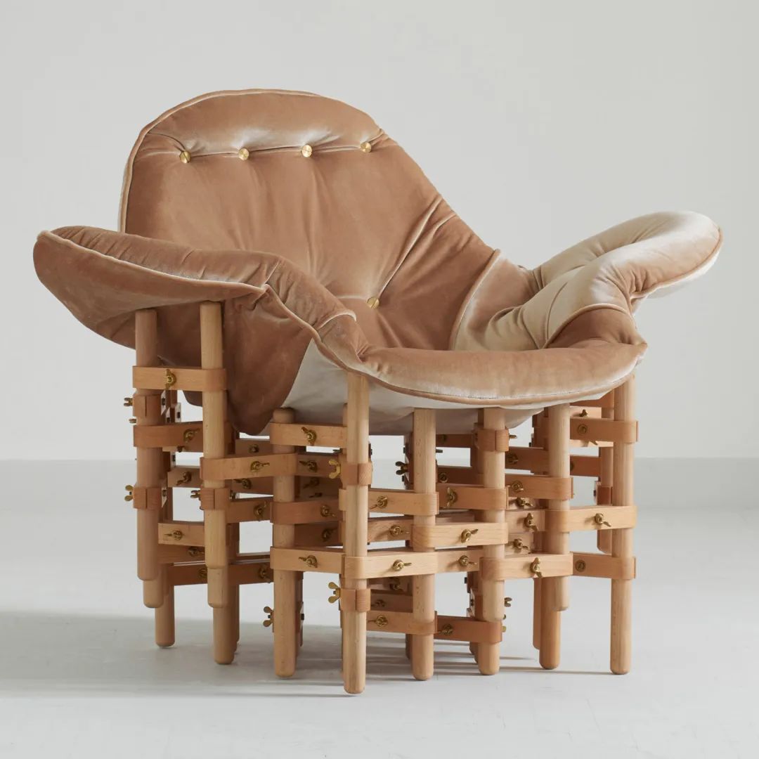 這個由設計師Marija Puipait?和Vytautas Ge?as設計的“設想的舒適”家具系列中簇絨,粉紅色天鵝絨座椅下垂在互鎖的木銷上。