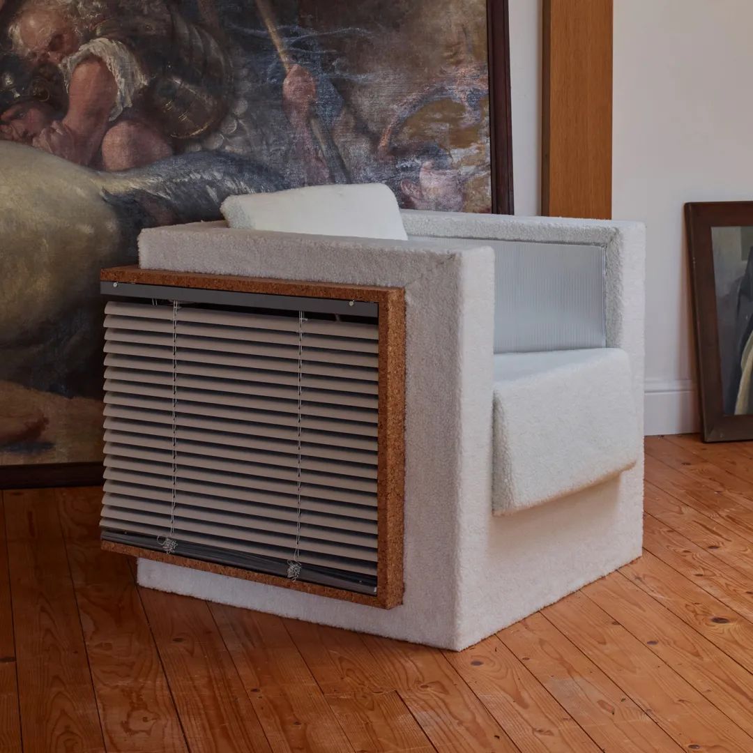 EJR Barnes用長方百葉窗包裹了這個長方體形的椅子,百葉窗插入其側面和背面,并以軟木窗框做邊界。